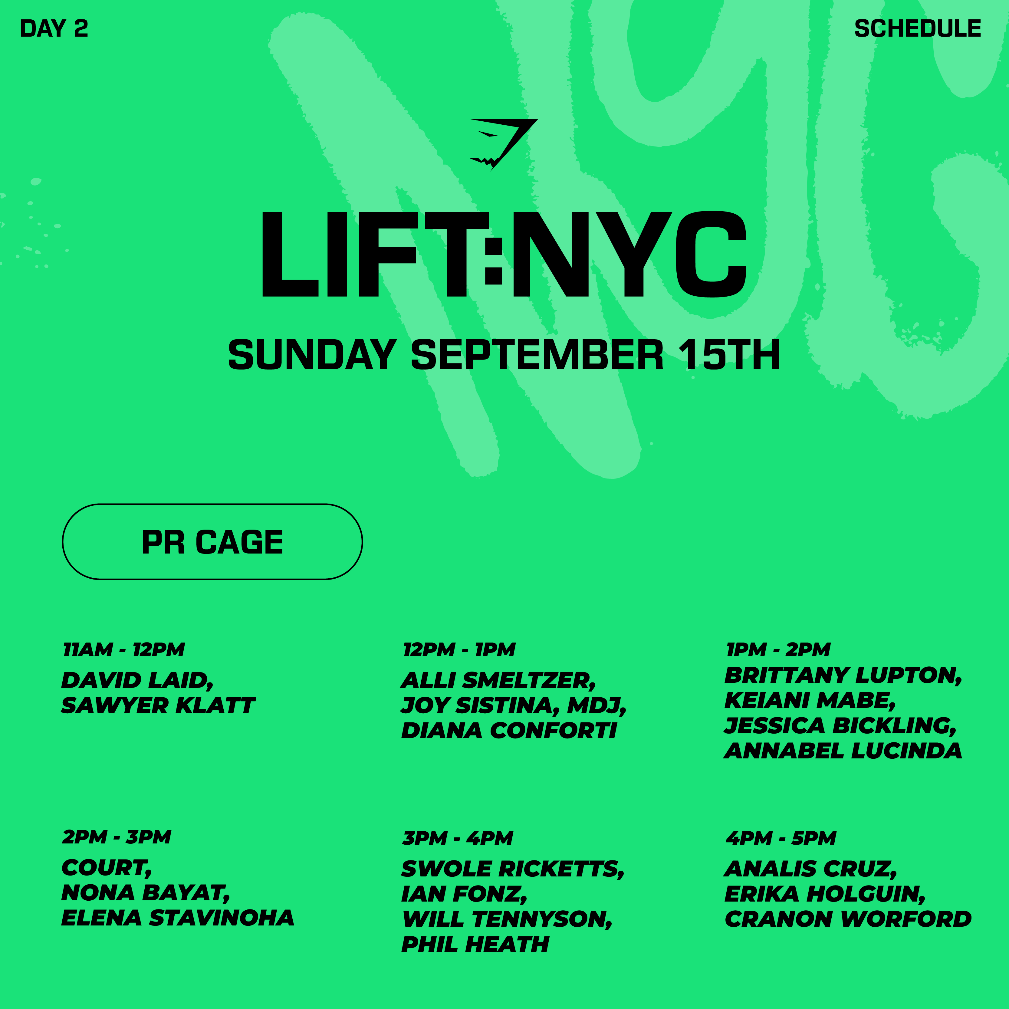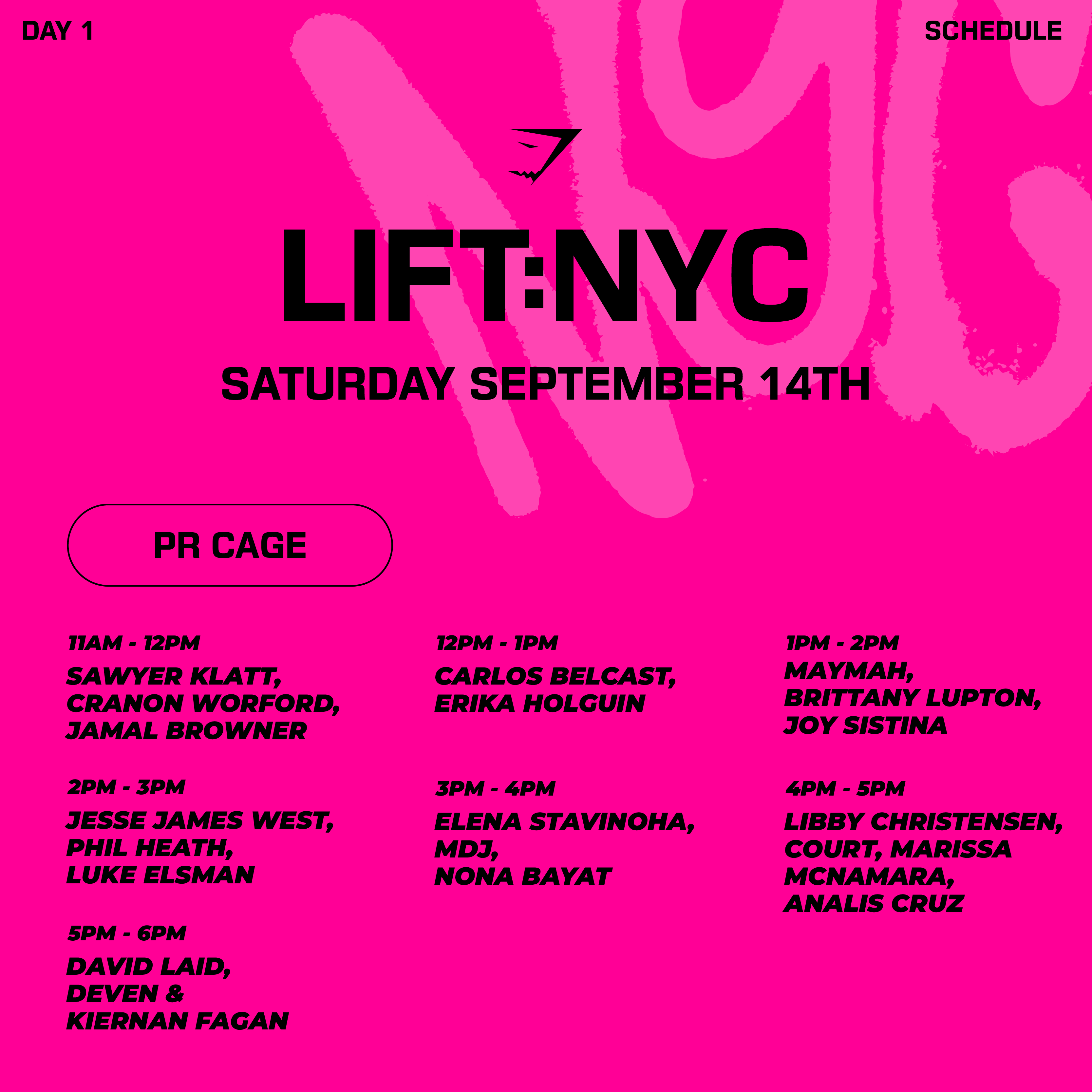 Sometimes the best hype for some heavy lifting is watching others rip a few PRs. Designed to get the adrenaline pumping, 3 PR cages will touch ground at Lift NYC: our athletes will be attempting some big numbers themselves, but the floor is open to all...