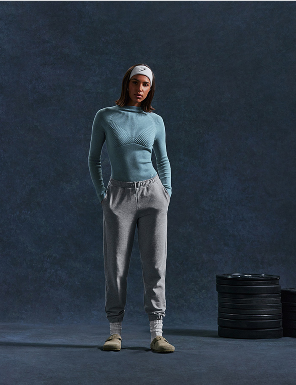 Left: Wears Rest Day Sweats Joggers in Grey, Rest Day Seamless Turtleneck in Charred Blue, Sharkhead Headband in White