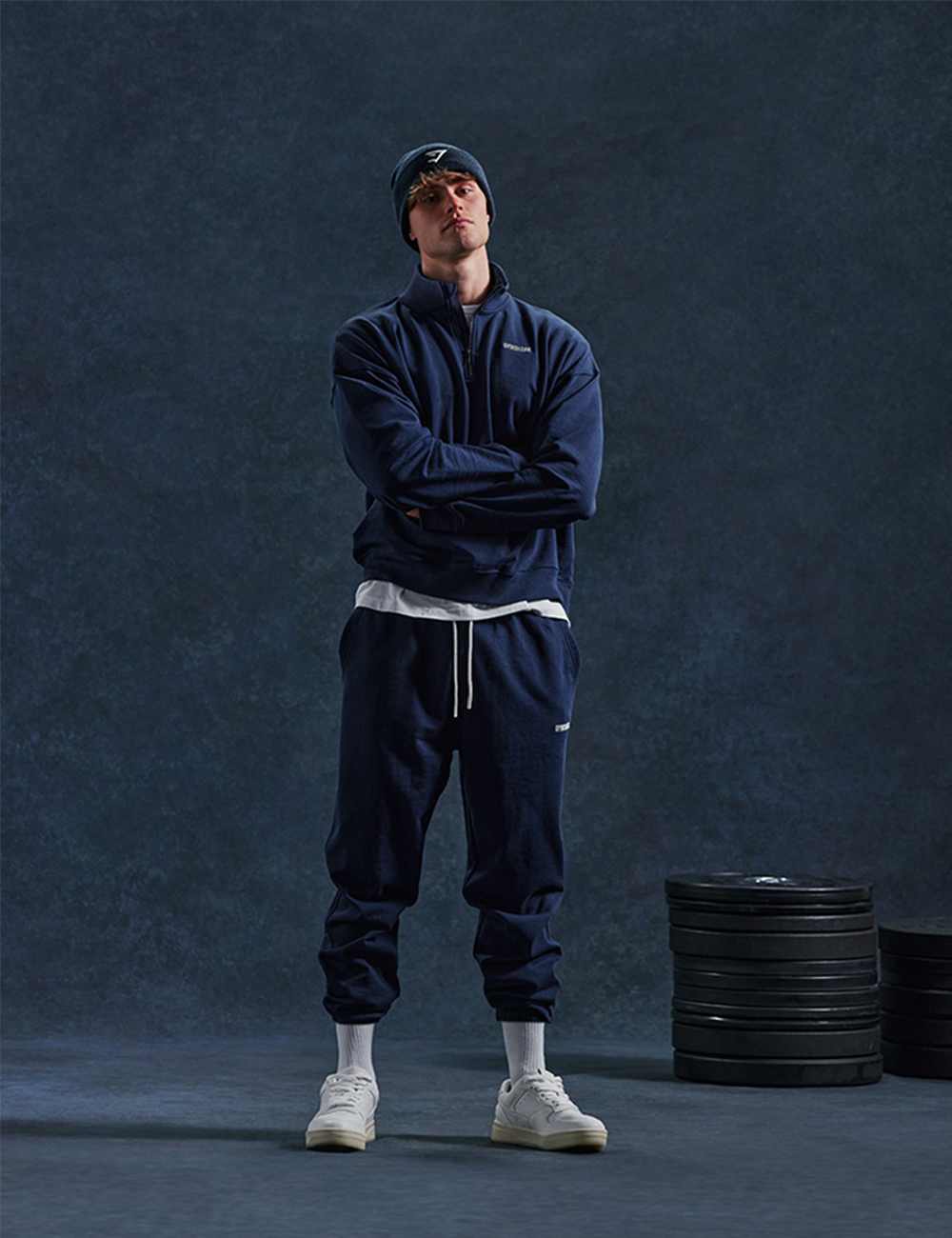 Right: Wears Rest Day Sweats 1/4 Zip and Rest Day Sweats Pants in Navy, Sharkhead Beanie in Navy
