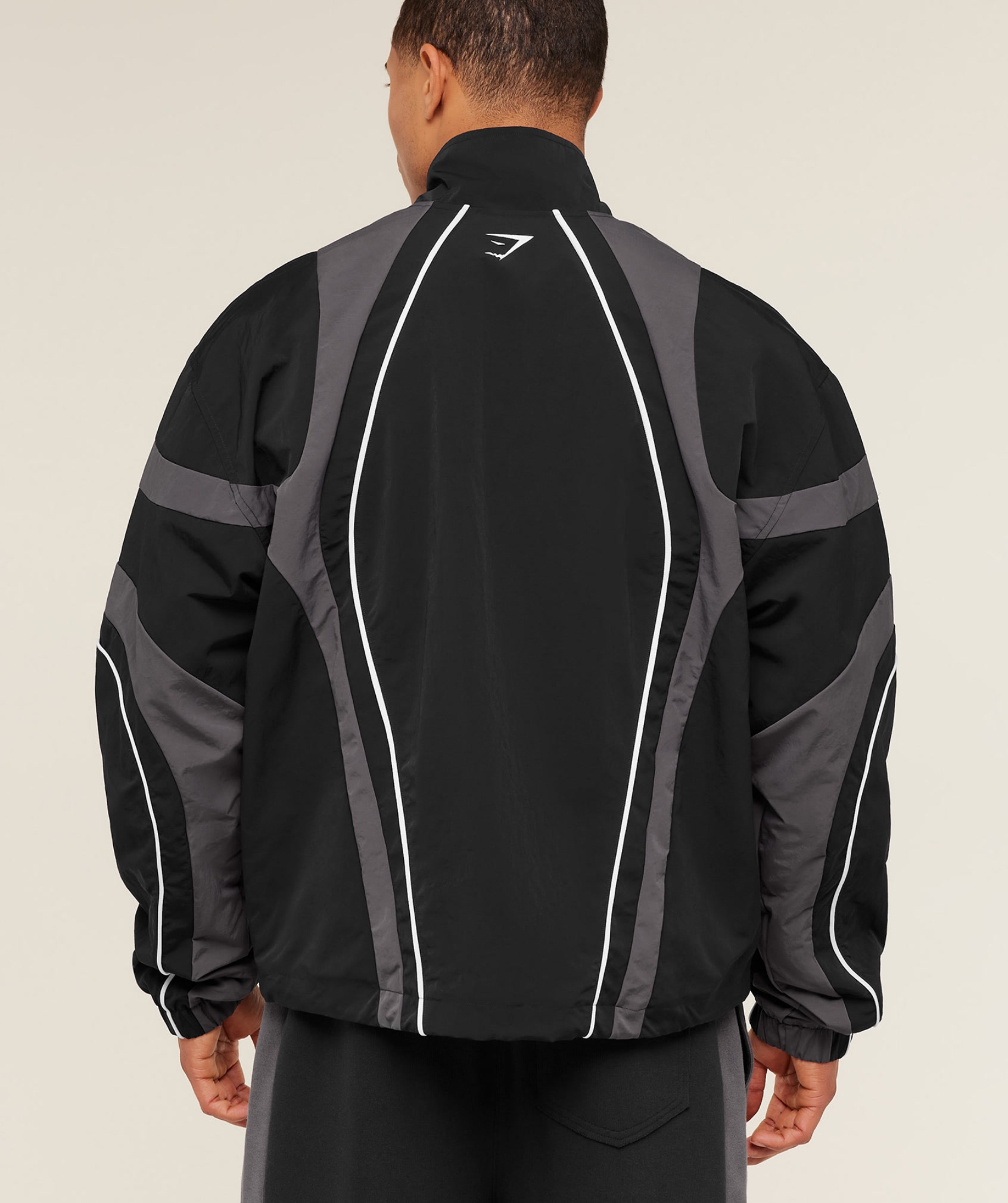 Chaqueta extragrande para combinar en capas, con paneles en contraste, cuello alto, bajo con cordón, bolsillos con corchetes y parche de Carlos Belcast.